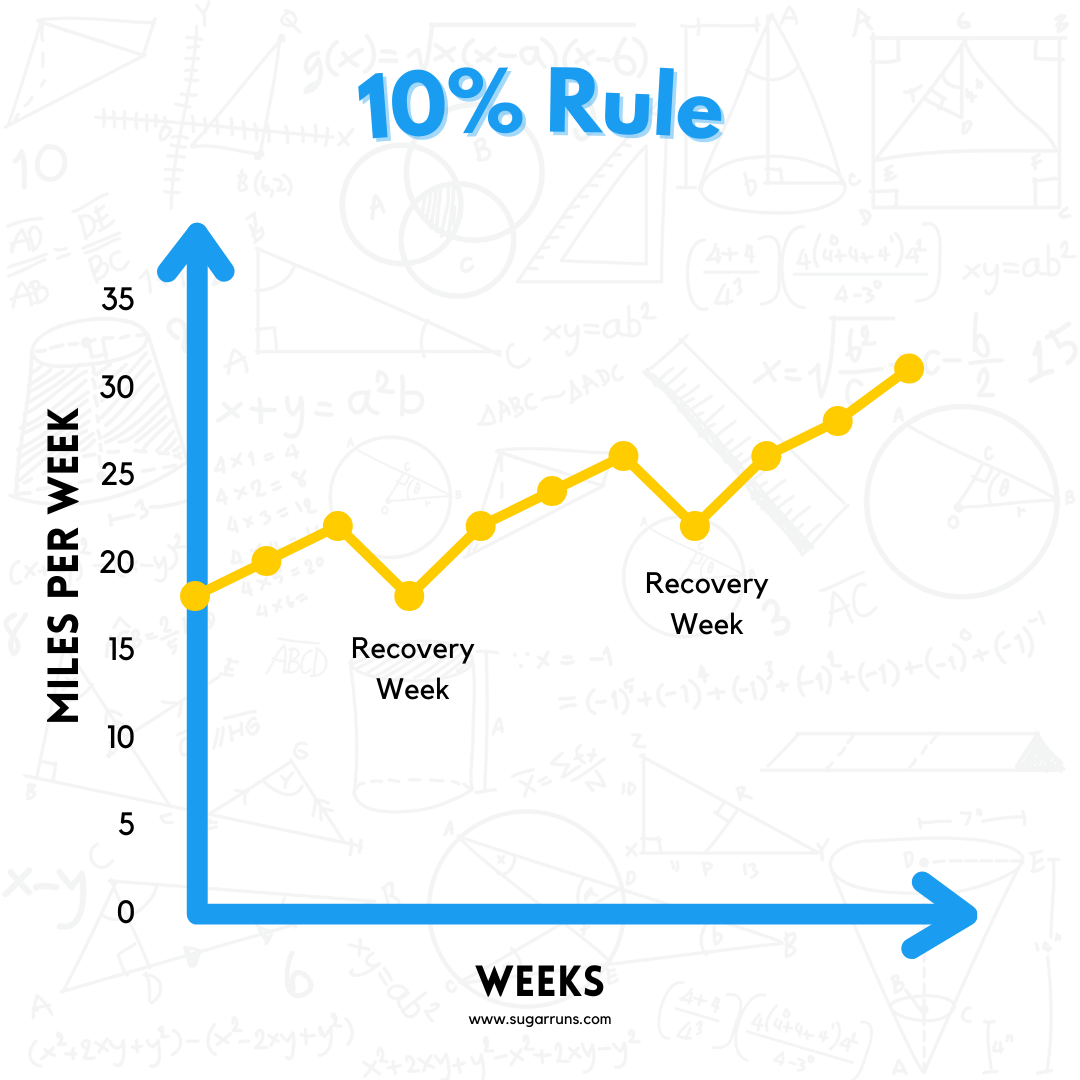 The 10% rule in running states that you should not increase your mileage by more than 10% from week-to-week. A majority of running injuries are overuse injuries, so the goal of the 10% rule is to prevent runners from doing too much, too soon to avoid injuries associated with large jumps in training volume.